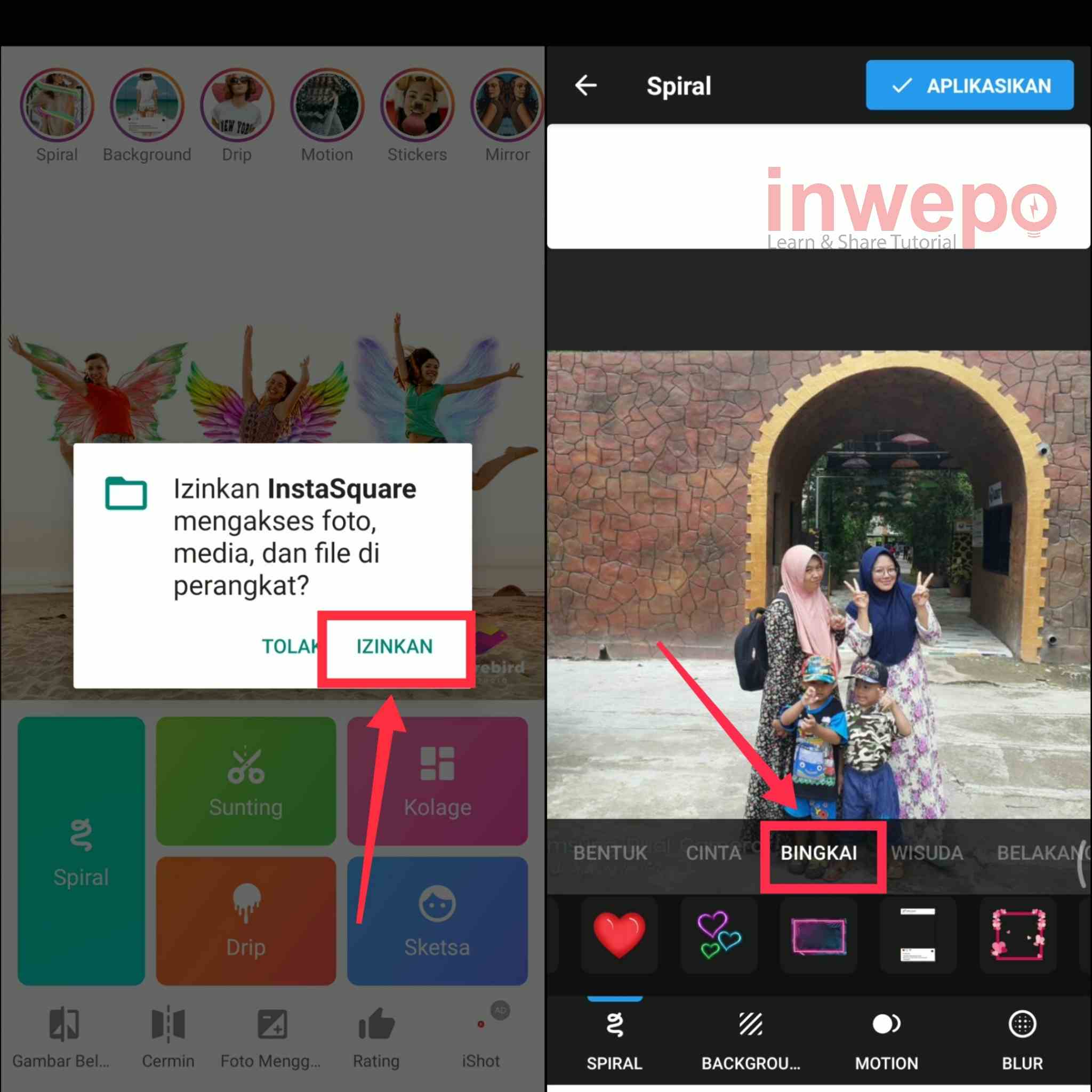 3. Langkah ketiga, beri izin akses pada aplikasi dengan tap Izinkan. Lalu akan muncul banyak menu pilih menu Bingkai.