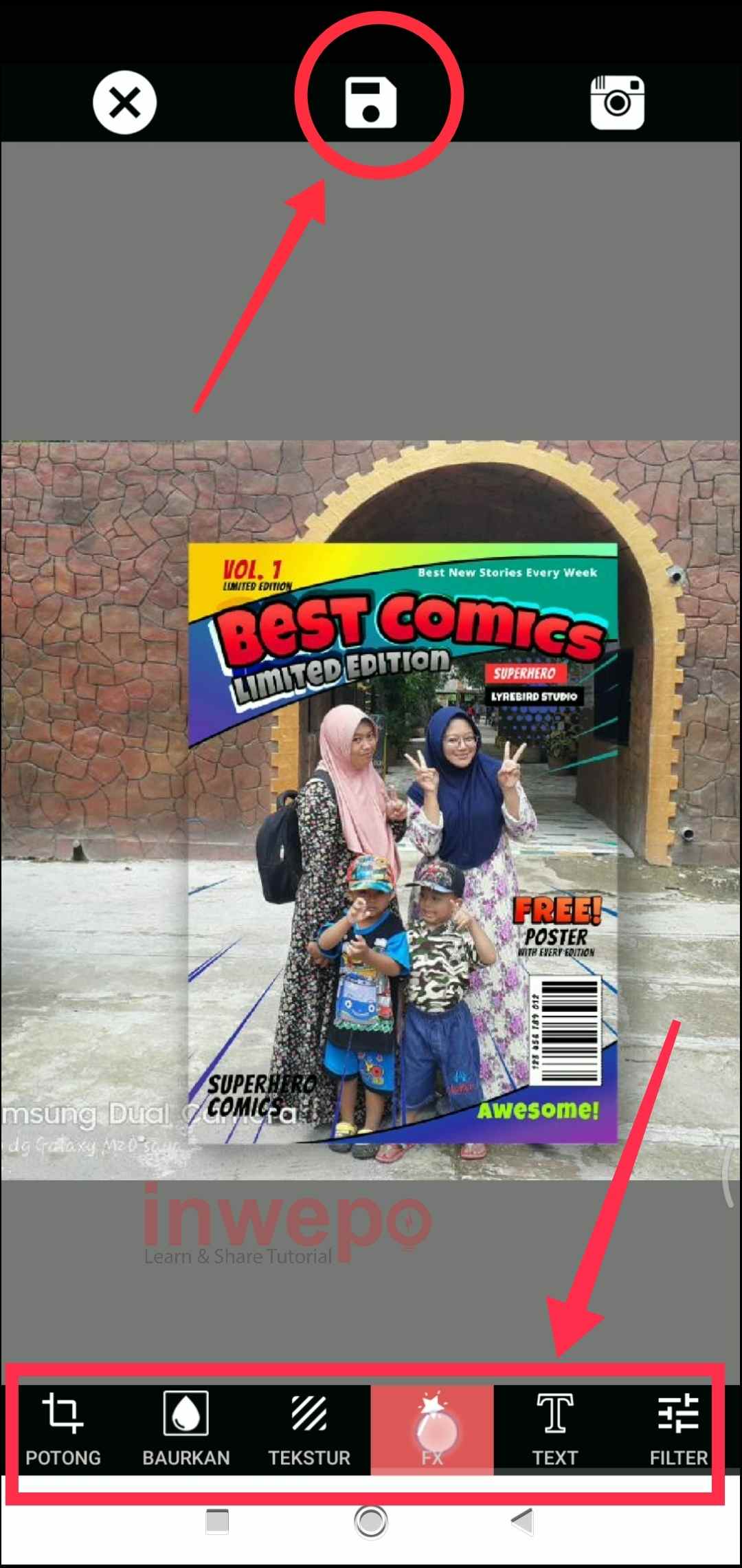 5. Langkah kelima, gunakan menu yang di bagian bawah seperti efek , teks dan lain lain. Jika dirasa sudah cukup semua tap icon disk untuk menyimpannya.