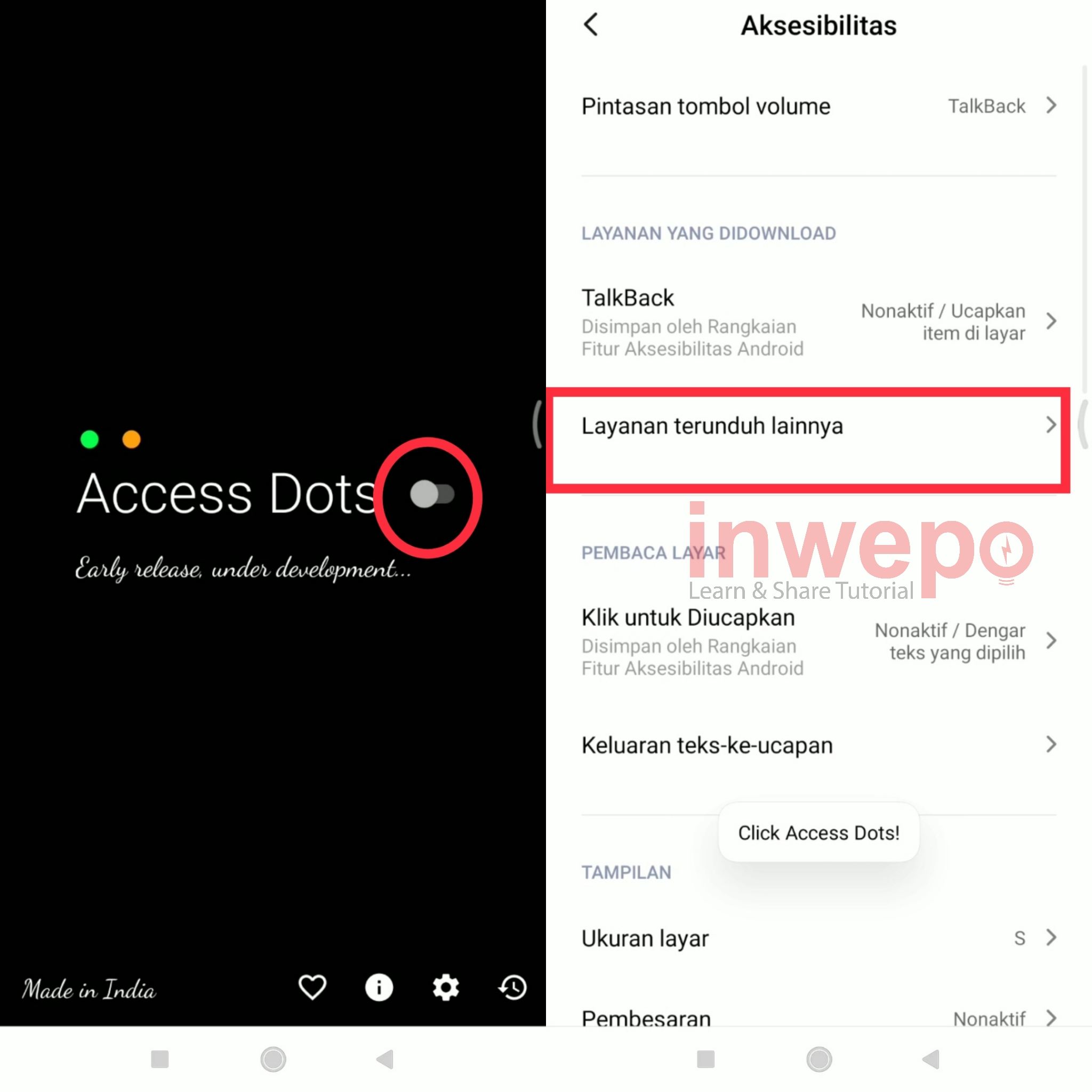 2. Buka aplikasi Access Dots yang sudah terunduh. Kalian bisa langsung memilih untuk mengaktifkan tombol yang berada di layar awal aplikasi. Kamu akan di arahkan ke menu Aksebilitas, lalu pilih Layanan terunduh lainnya.