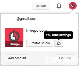 1. Login Gmail dan buka YouTube Channel lalu di sudut kanan atas klik icon avatar kamu hingga terlihat menu pop-up. Kemudian klik icon gear YouTube settings.