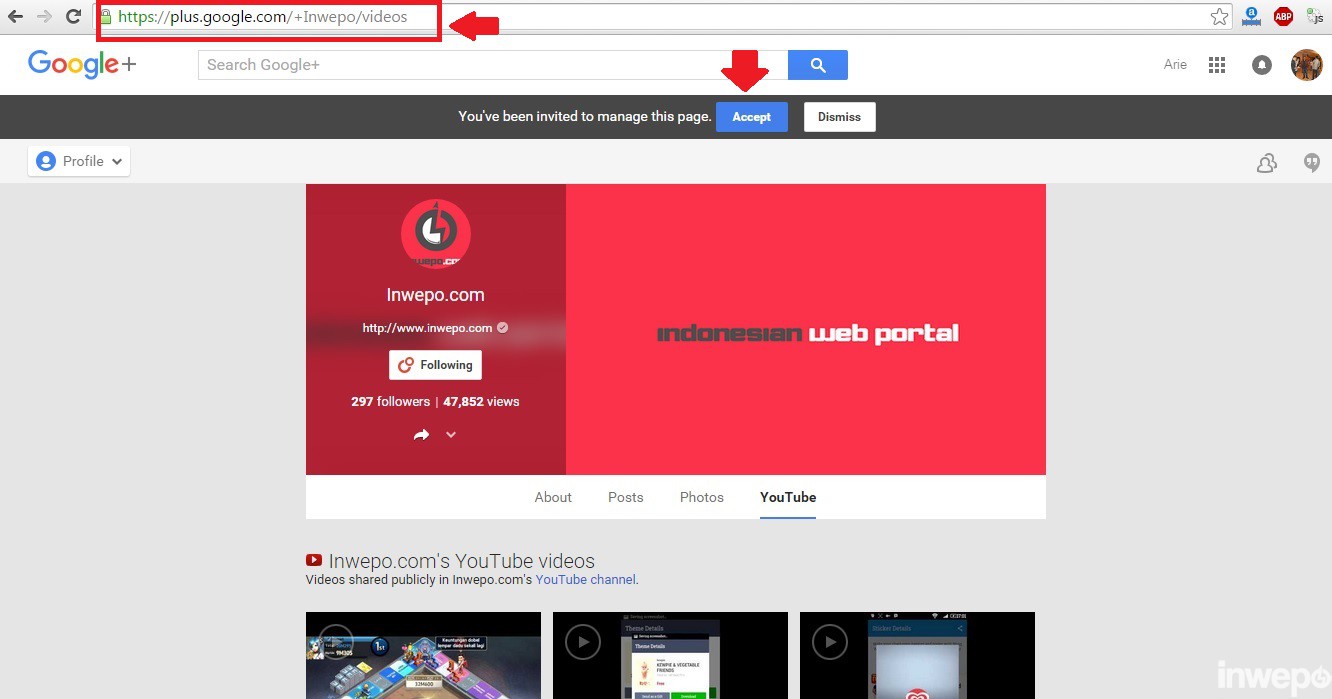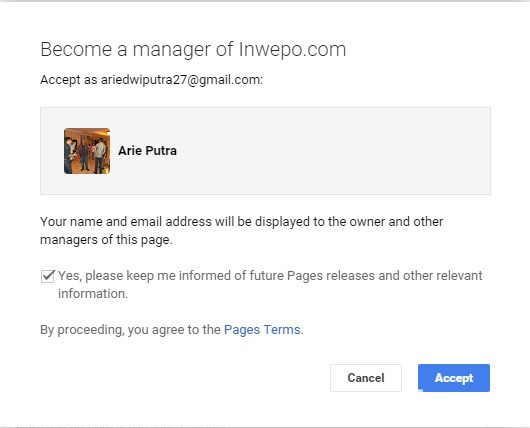 6. Selanjutnya langkah untuk konfrimasi undangan, login akun gmail yang telah di invite/diundang lalu buka situs Google Plus page yang terkait dari akun Youtube channel-nya. Nanti akan terlihat notifikasi “You’ve been invited to manage this page”. Pilih Accept.