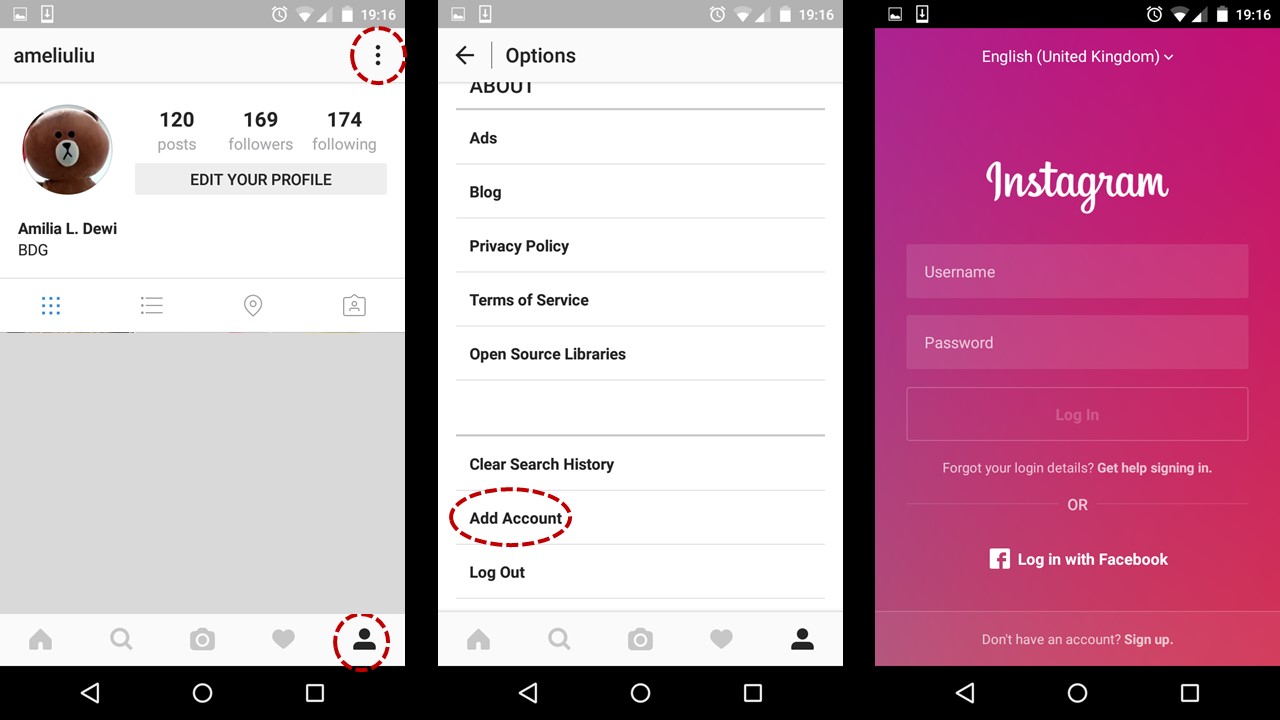 3. Scroll ke bawah, cari dan tekan menu Add Account ( maksimal 5 Akun Instagram).