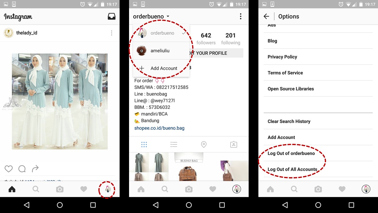 6. Untuk keluar dari salah satu atau semua akun Instagram, pilih akun yang akan di logout, kemudian masuk ke menu Options. Scroll ke bawah dan cari menu Log Out.