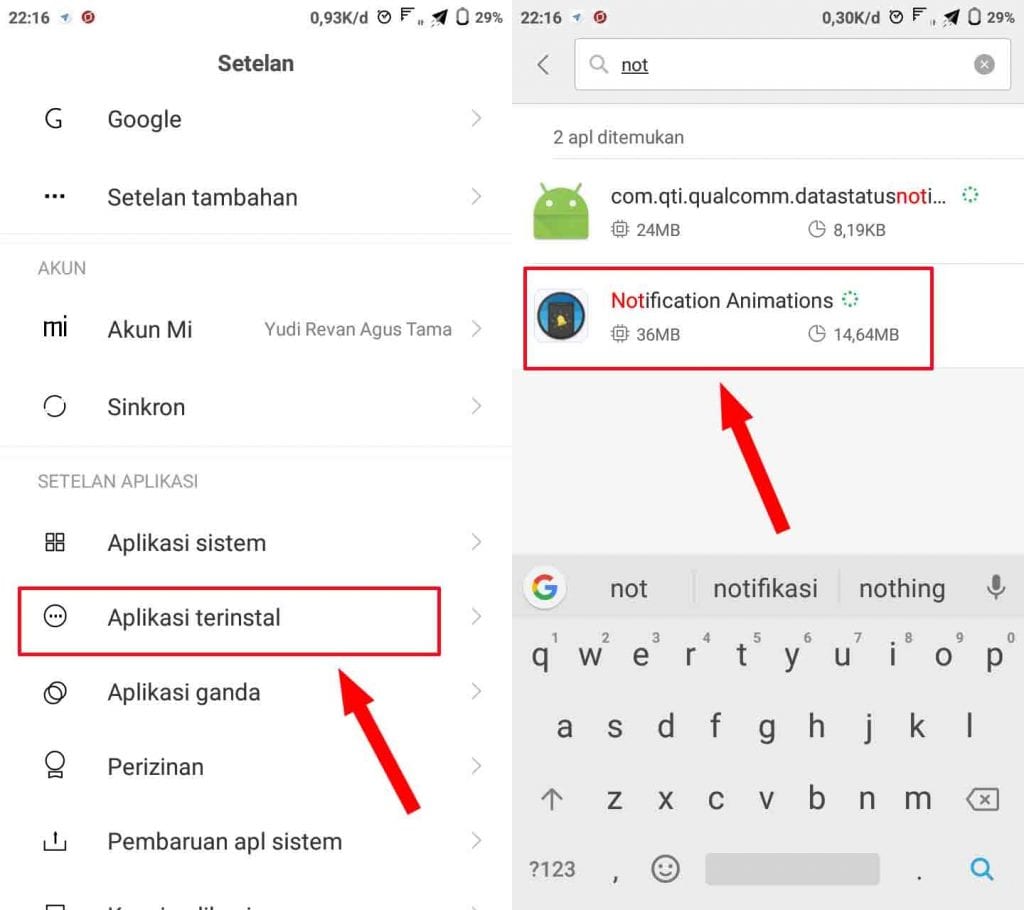 2. Setelah berhasil terinstall jangan dulu buka aplikasinya, buka terlebih dahulu menu Setelan kemudian pilih Aplikasi terinstal lalu cari dan pilih Notification Animations.