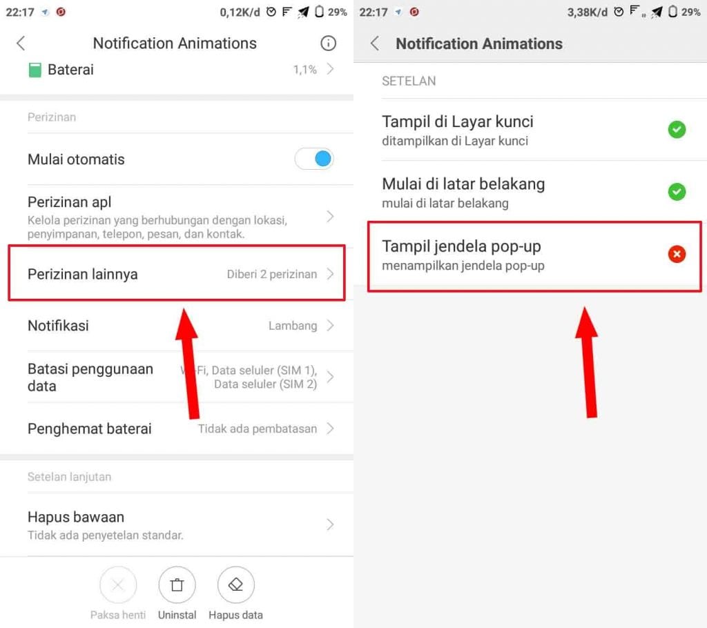 4. Tap Perizinan lainnya kemudian tap Jendela pop-up untuk mengizinkan akses pop-up aplikasi.