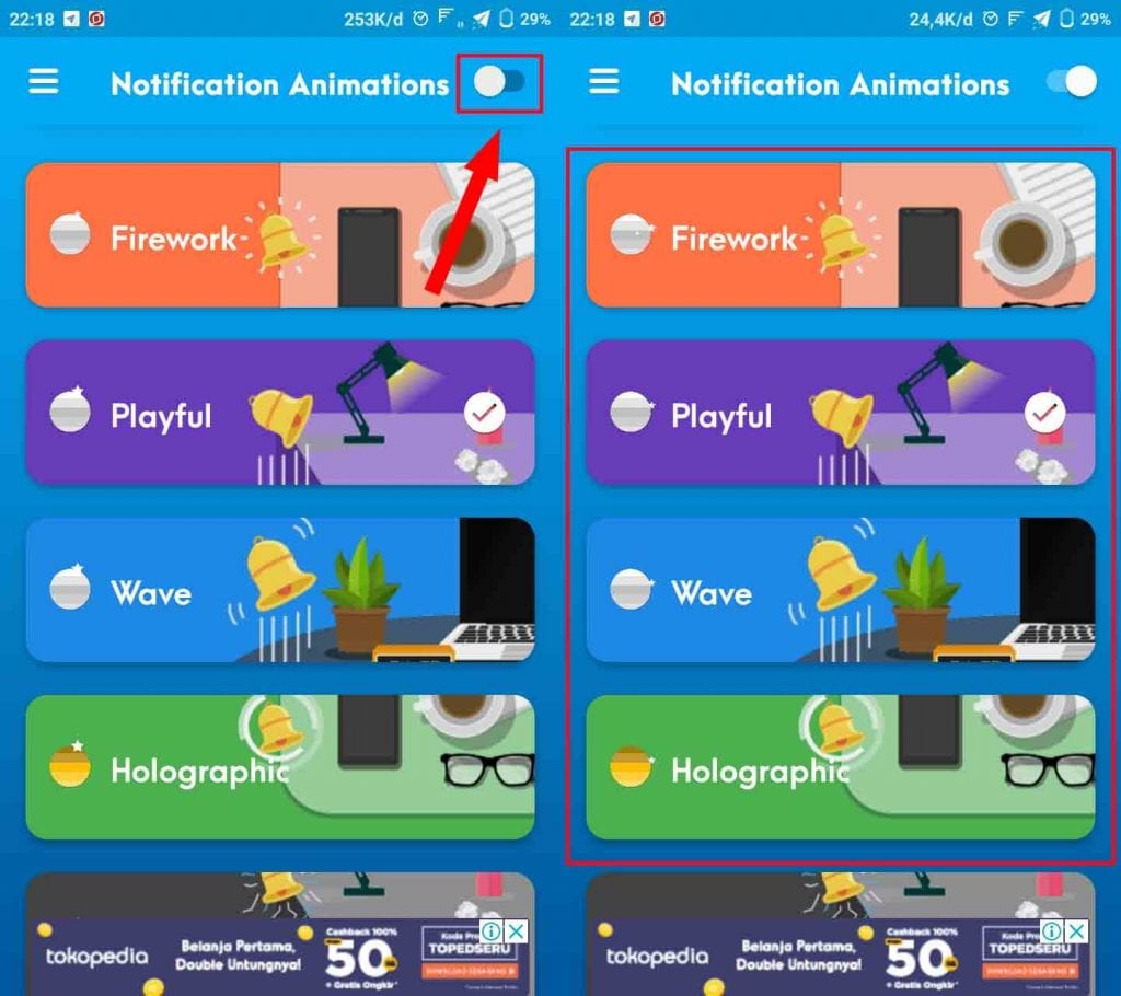 7. Buka aplikasi Notification Animations lalu tap tombol di pojok kanan atas untuk mengaktifkan, selanjutnya pilih efek-efek animasi yang akan kamu gunakan.
