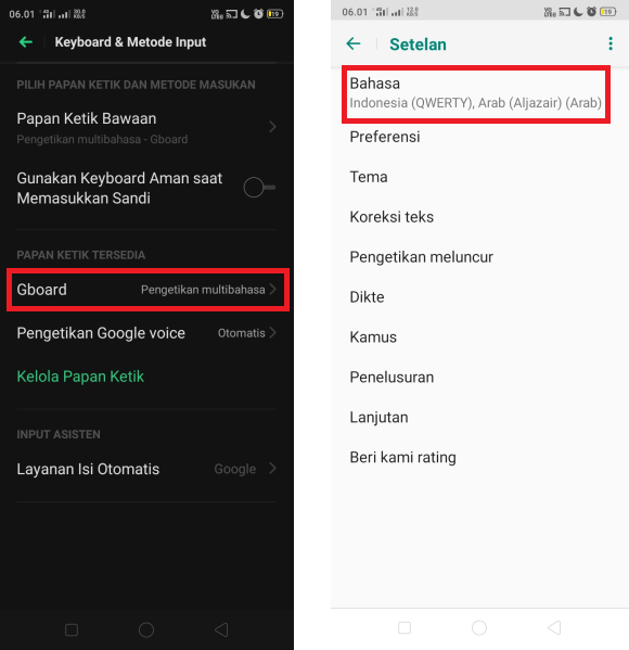 3. Pilih dan klik ikon panah samping ‘Gboard’. Maka muncul ‘Pengaturan/ Setelan’ GBoard. Untuk menambahkan bahasa lain di GBoard pilih fitur ‘Bahasa’.