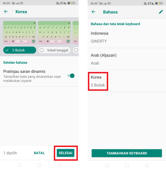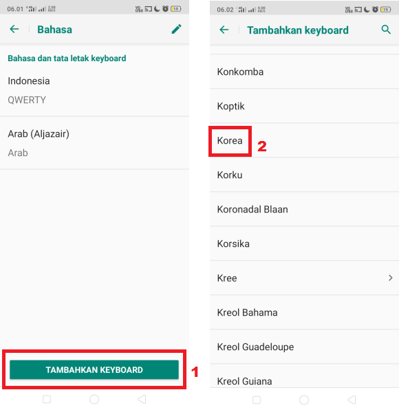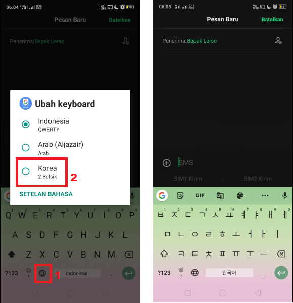 Klik dan tekan agak lama ikon ‘Globe’ untuk mengubah huruf di papan ketik GBoard. Disini saya akan memilih bahasa Korea. Selesai. sekarang papan ketik GBoard berubah menjadi huruf Korea.