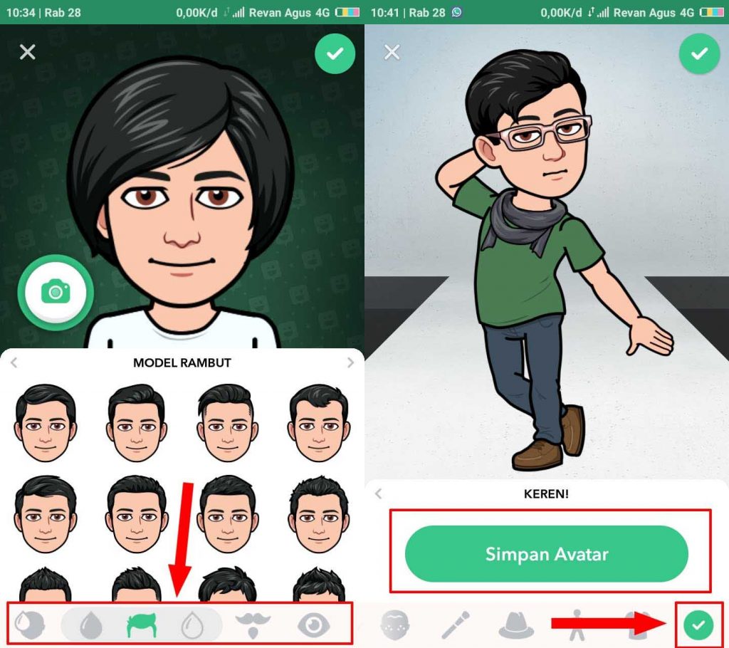 Langkah ketiga, kamu bisa langsung menggunakan menu yang ada di bawah untuk mengedit bagian wajah hingga pakaian. Bisa juga berfoto selfie dahulu dengan memilih/tap icon camera untuk lebih menyamakan dengan wajah kamu sendiri. Jika sudah geser menu bawah ke kiri hingga menemukan tanda ceklis lalu pilih Simpan Avatar.
