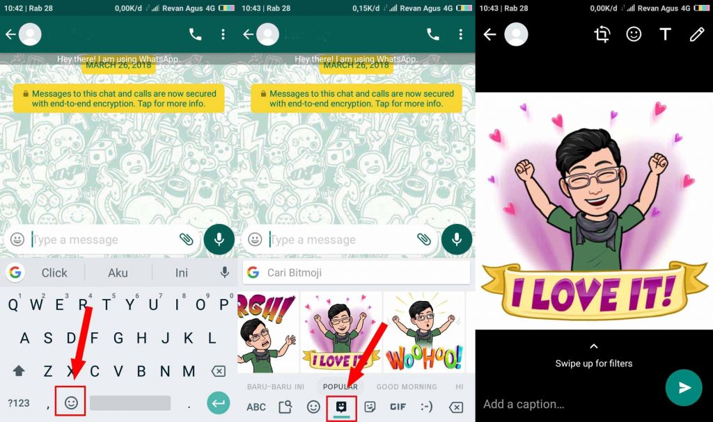 Langkah keempat, coba buka aplikasi chatting apa saja, pada tutorial ini mencoba menggunakan aplikasi WhatsApp. Lalu aktifkan keyboard seperti saat ingin menulis pesan dan tap pada icon smiley di sebelah tombol spasi. Geser kekiri hingga menemukan icon Bitmoji dan coba pilih salah satu stiker kemudian kirim ke teman atau siapa saja.