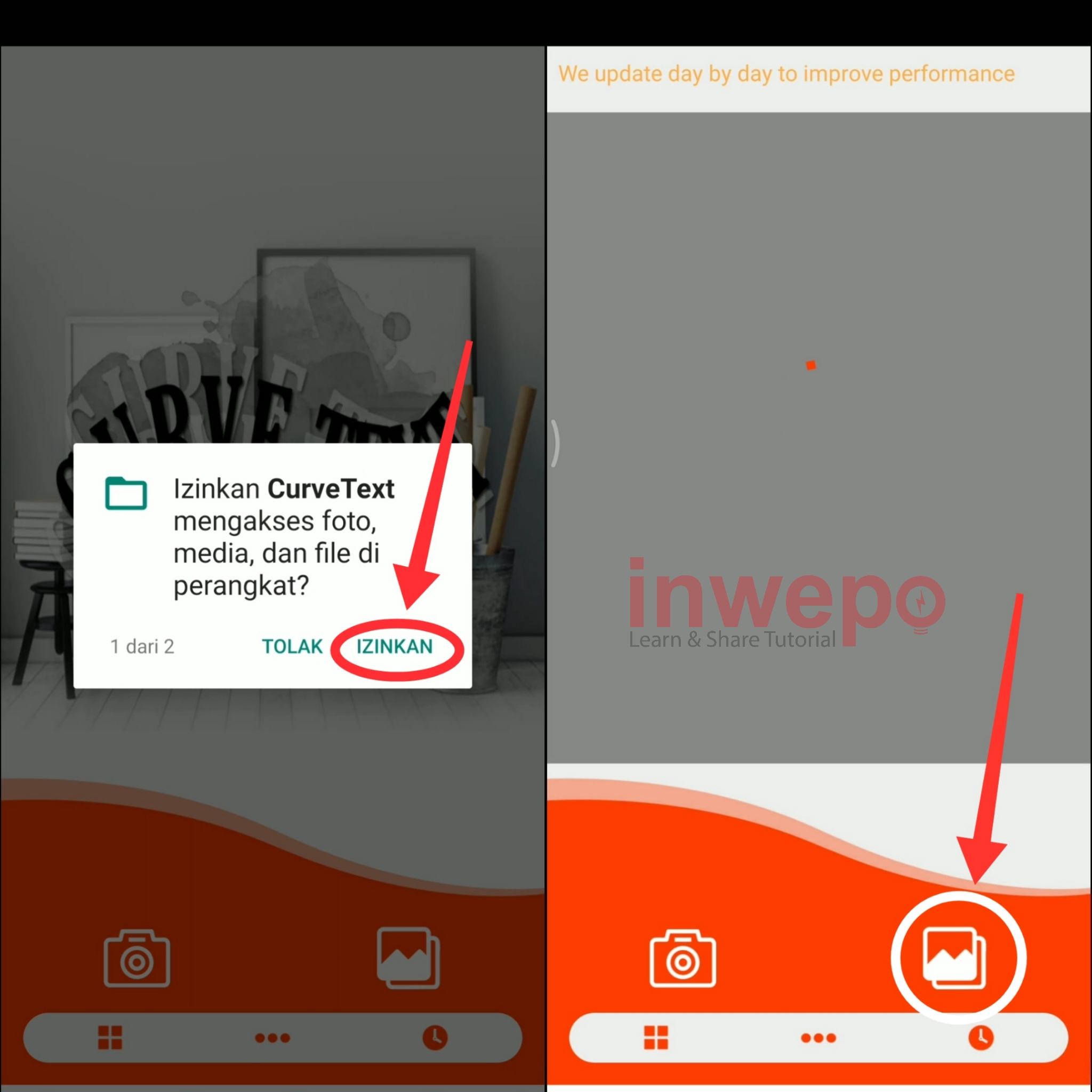 2. Langkah kedua, jika sudah terinstall dengan baik, buka aplikasi Curve Text lalu beri izin akses pada aplikasi dengan tap Izinkan lalu pilih icon picture untuk menambahkan foto dari galeri smartphone. Atau bisa juga tap icon kamera untuk menambahkan foto dari kamera langsung.