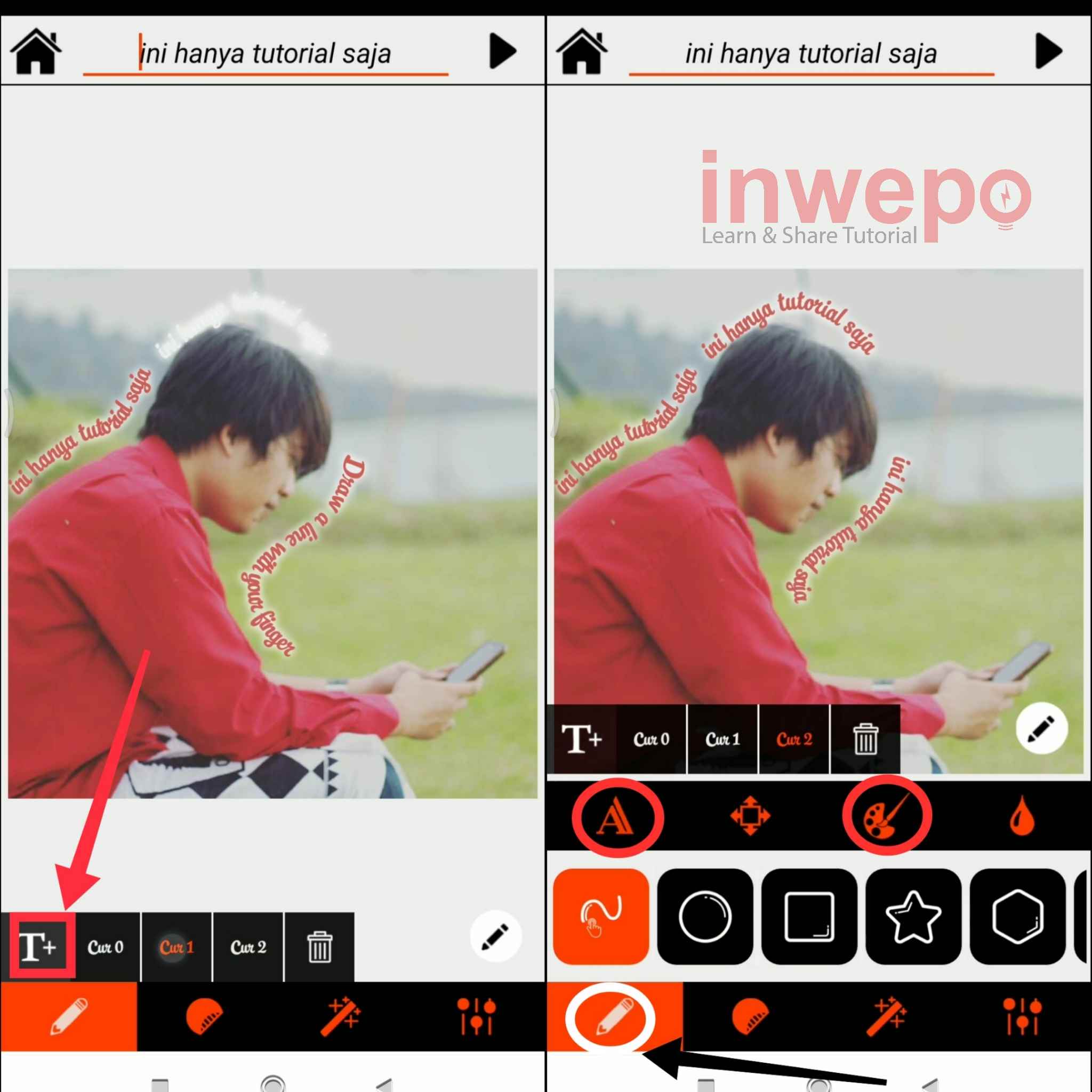 4. Langkah keempat, langsung sapukan jari untuk membuat text mengitari objek. Disini kamu bisa menambahkan hingga 3 text dengan cara tap icon T+ yang ada di bawah. Selanjutnya tap icon pensil lalu gunakan menu A untuk mengubah style font dan menu palet warna untuk mengganti warna text.