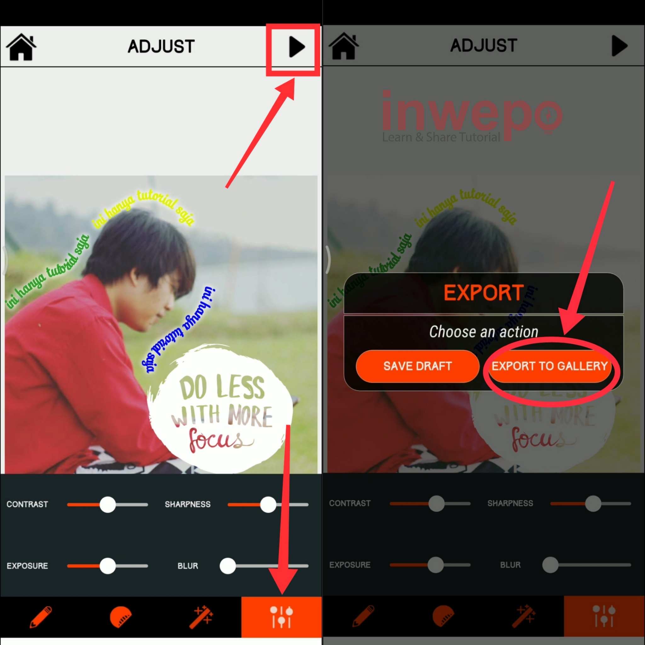 6. Langkah keenam, gunakan icon setting yang paling pojok untuk mengatur contrast, blur, dan lain lain. Jika dirasa sudah cukup tap icon play yg berada di bagian atas. Pilih EXPORT TO GALLERY untuk menyimpan foto ke galeri smartphone.