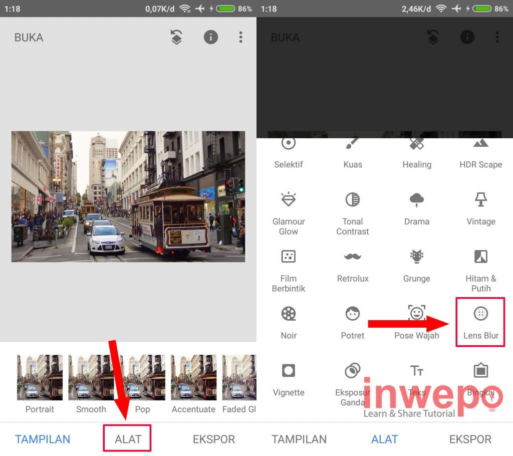 3. Langkah ketiga, tap menu ALAT lalu pilih lagi menu Lens Blur.