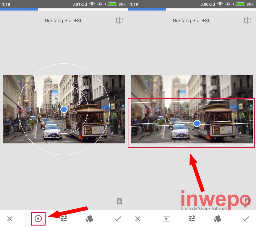 4. Langkah keempat, tap menu circle blur di bawah untuk mengubahnya menjadi horizontal. Sesuaikan fokus pada foto yang akan di edit.