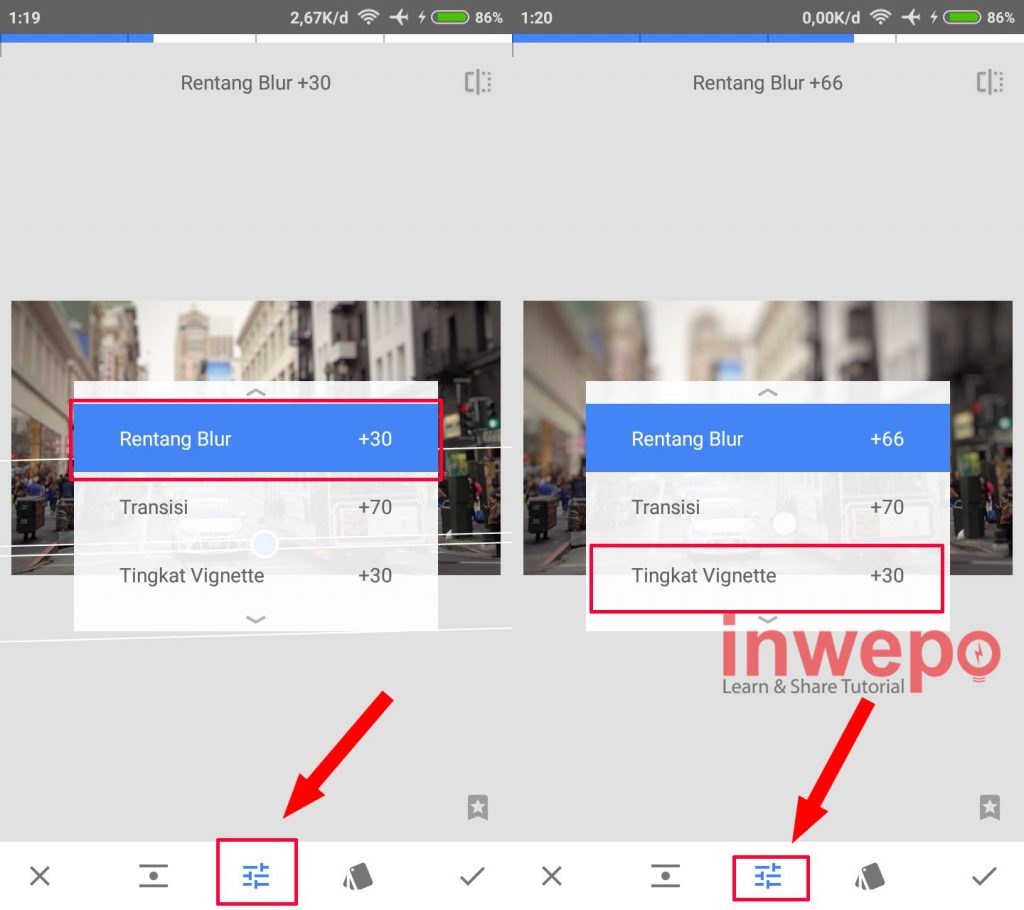 5. Langkah kelima, tap menu 3 garis di bawah kemudian pilih Rentang Blur. Selanjutnya geser ke kanan dimana saja untuk mempertajam efek blur pada foto. Berikutnya pilih Tingkat Vignette dan lakukan hal yang sama untuk mempertajam efek Vignette. Jika sudah sesuai tap ceklis yang berada di pojok kanan bawah.