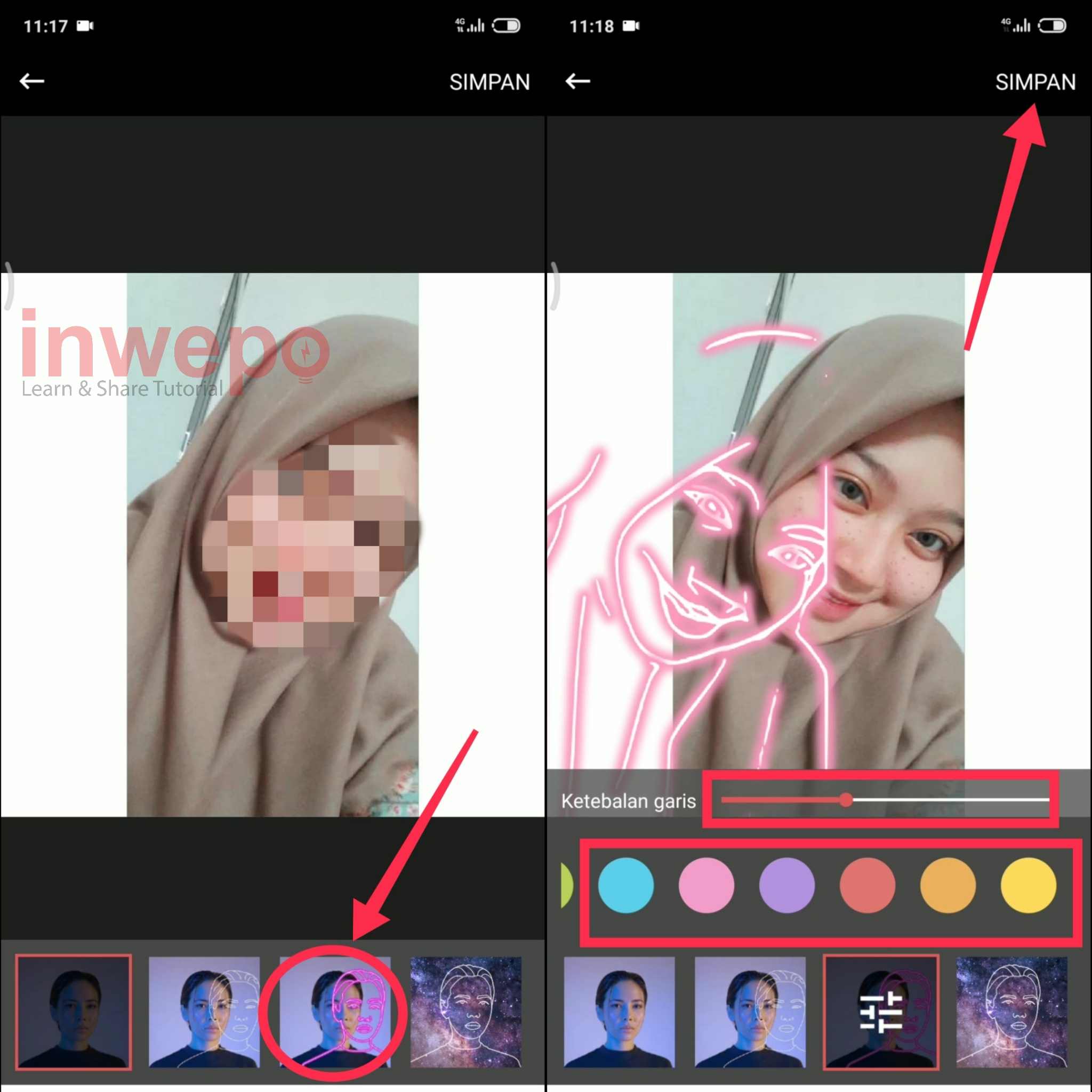 Untuk mengubah warna neon kamu bisa gunakan icon warna yang berada di bawahnya. Kamu juga bisa mencoba menambahkan efek yang lain dengan menggunakan menu yang berada paling bawah. Jika sudah tap menu Simpan yang berada di atas untuk menyimpan hasil editan kamu ke galeri smartphone.