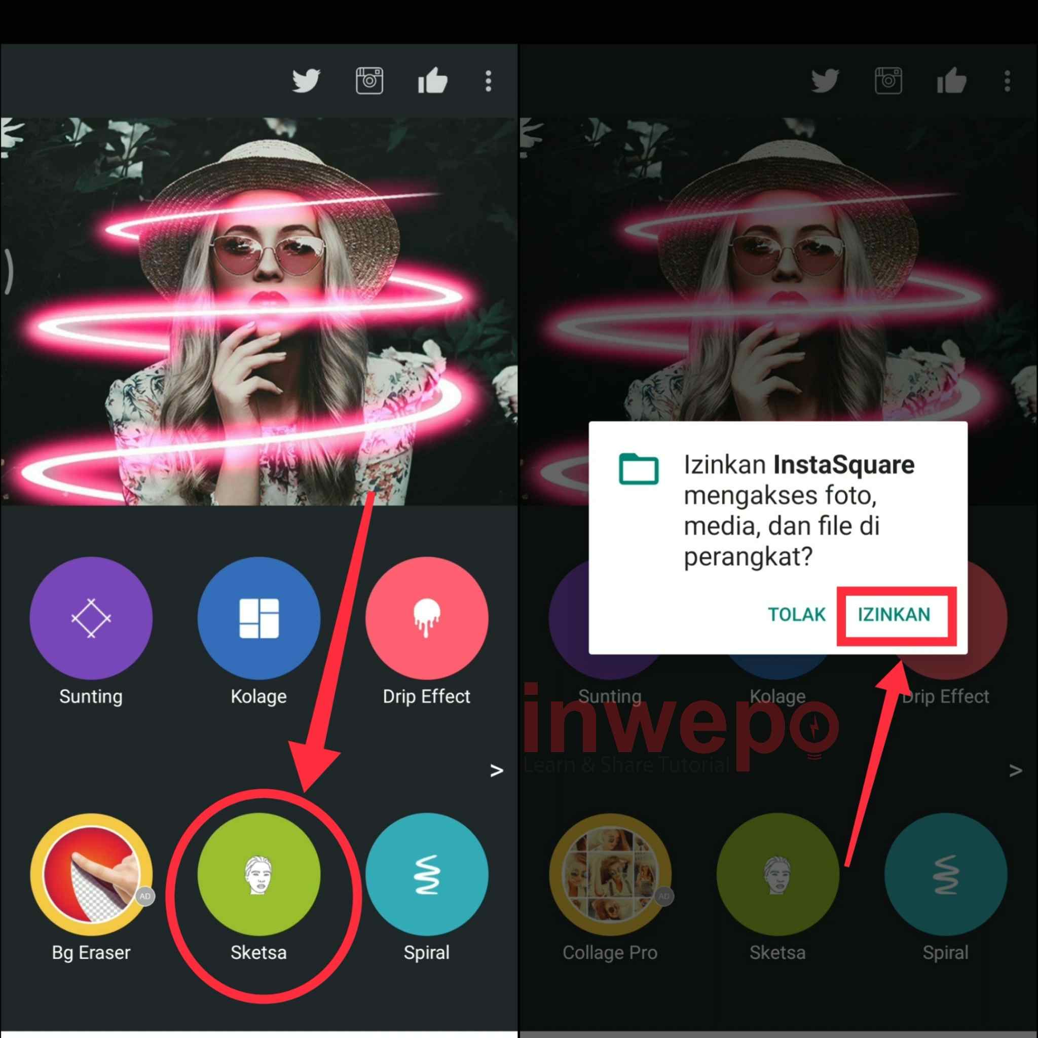 2. Langkah kedua, jika sudah terinstall dengan baik langsung saja buka aplikasi Instasquare, akan ada beberapa pilihan menu, langsung pilih saja menu Sketsa. Berikutnya kamu di wajibkan memberi izin akses pada aplikasi dengan tap menu Izinkan.