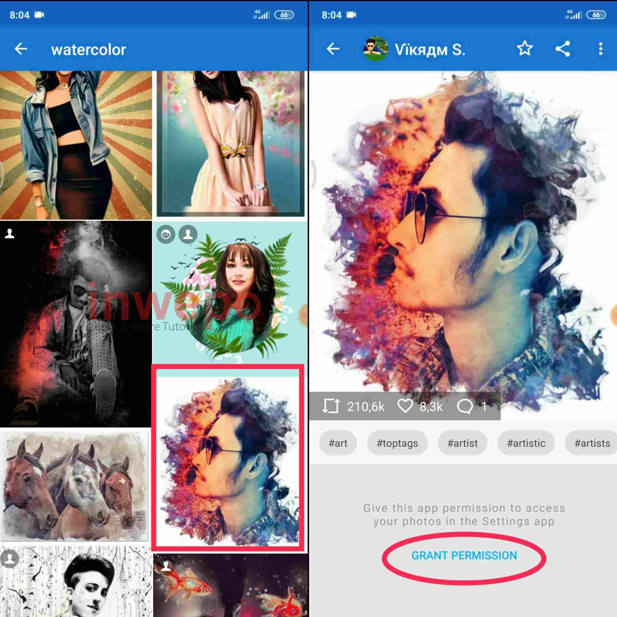3. Akan ada banyak sekali efek water color yang muncul, pilih efek yang sesuai. Lanjut tap menu GRANT PERMISSION.