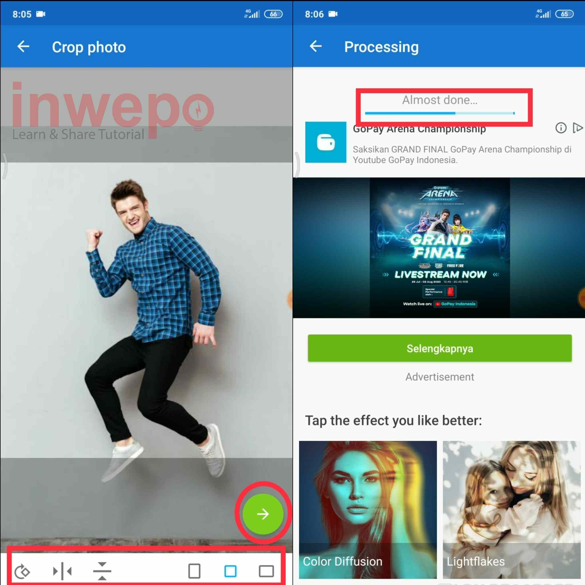 Selesai. Demikian Cara Menambahkan Efek Water Color Pada Photo di Android, dan simak tutorialnya di youtube inwepo dan jangan lupa untuk like, share, subscribe dan comment untuk tutorial menarik lainnya.
