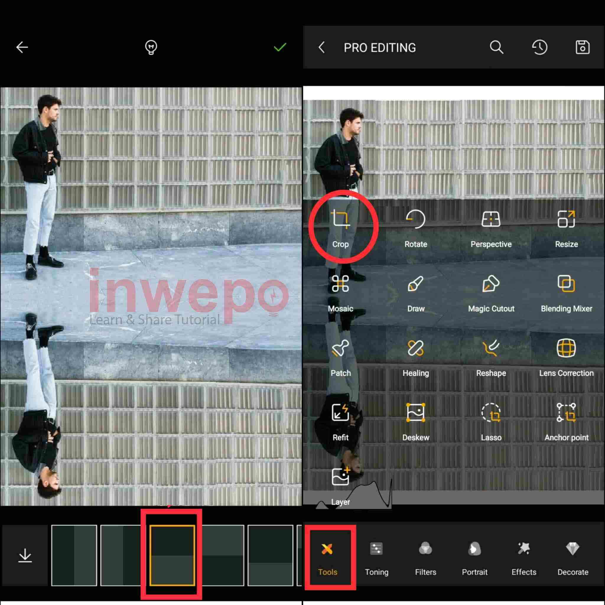 4. Ada beberapa pilihan mirror photo pilih urutan ke 3 atau atas bawah. Berikutnya tap menu Tools lalu pilih lagi menu Crop.
