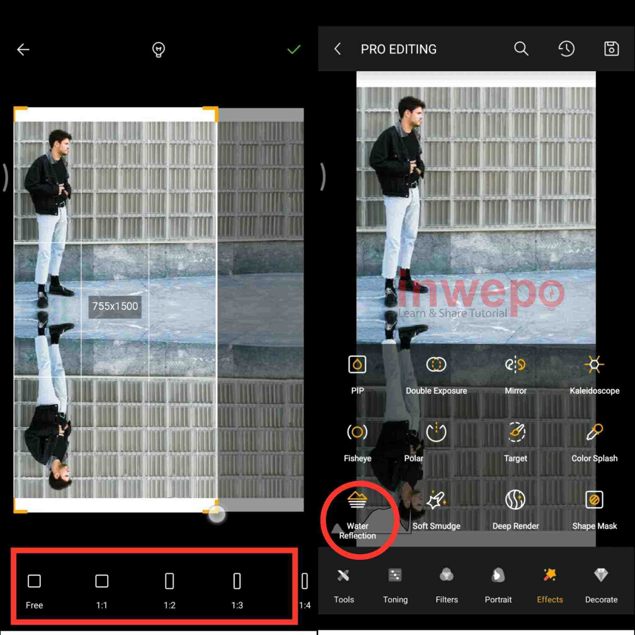 5. Atur ukuran crop foto yang akan kamu gunakan. Tap lagi menu Effect kemudian sekarang pilih menu Water Reflection.