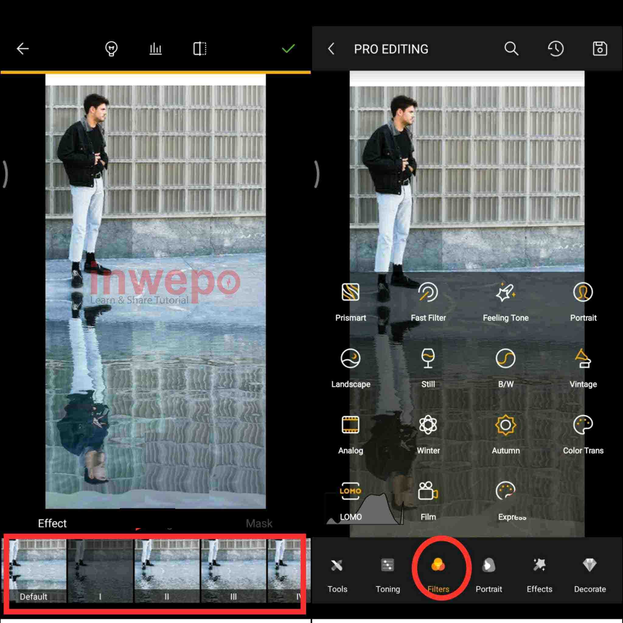 6. Ada beberapa pilihan efek water reflection yang bisa kamu gunakan. Kamu bisa memilih sesuai keinginan. Selanjutnya tap menu Filters lalu tambahkan efek filters warna yang sesuai.