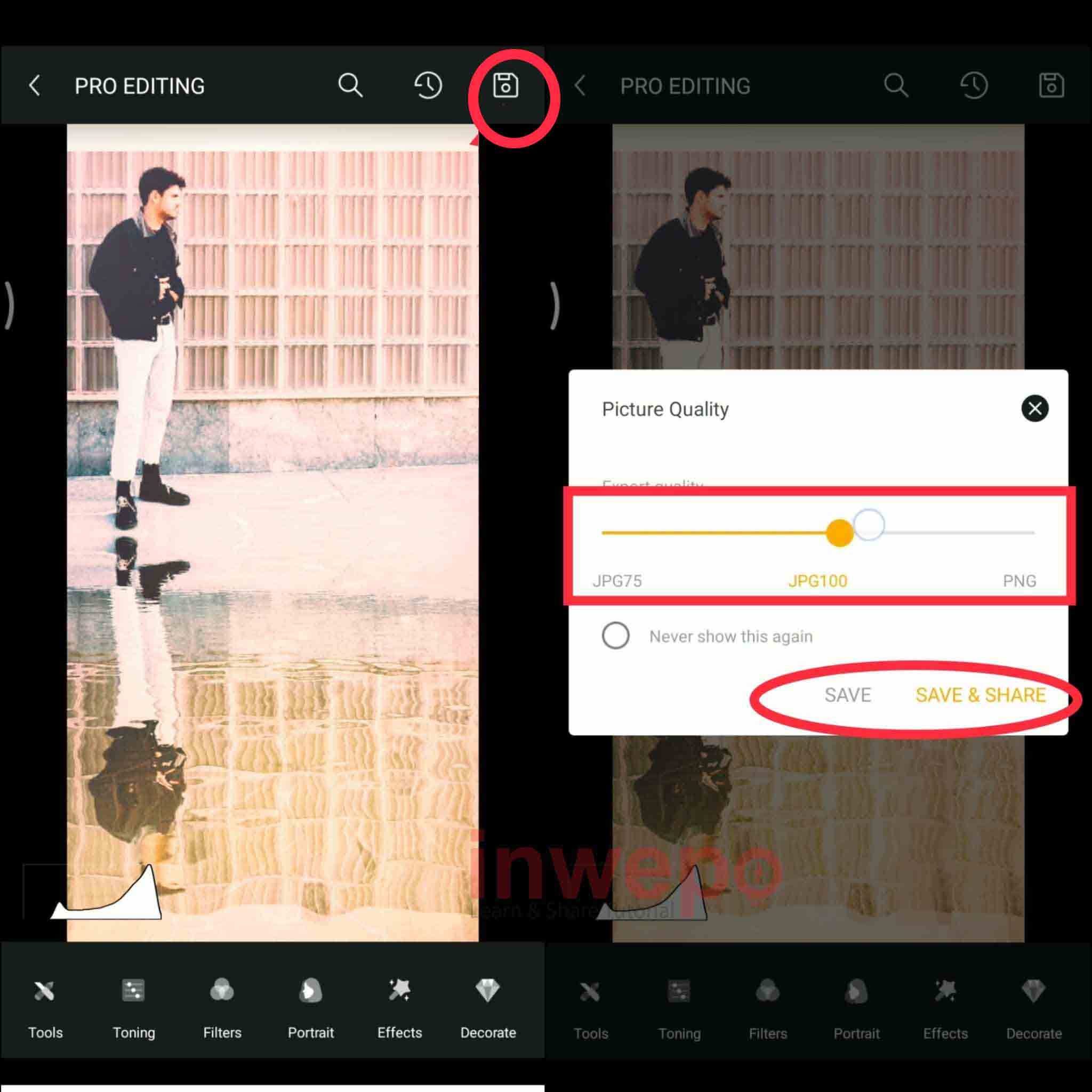 7. Langsung tap icon disk yang berada di pojok untuk segera menyimpan hasil editan ke galeri smartphone. Jangan lupa atur kualitas gambar terakhir tap menu Save untuk menyimpan atau Save & Share untuk menyimpan sekaligus membagikannya ke media sosial.