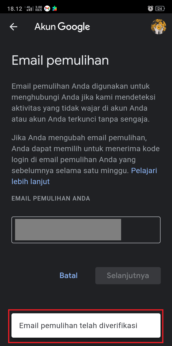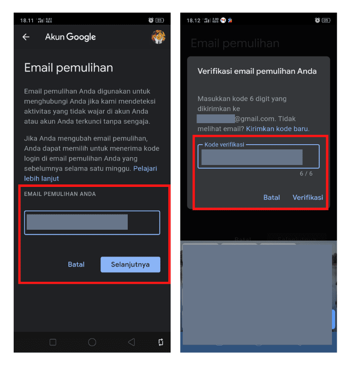5. Sekarang, kamu hanya perlu mengetikkan email pemulihan yang sudah kamu siapkan sebelumnya dan kemudian tekan Selanjutnya. Kemudian Google akan mengirimkan kode OTP ke alamat email pemulihan tersebut. Buka email yang kamu daftarkan sebagai email pemulihan untuk mengetahui kode OTP yang dikirimkan. Kode OTP yang kirimkan, akan berbeda-beda setiap kali kita menambahkan/ mengubah alamat email pemuulihan. Kemudian, ketikkan kode OTP pada kolom yang tersedia dan kemudian tekan tombol Verifikasi.