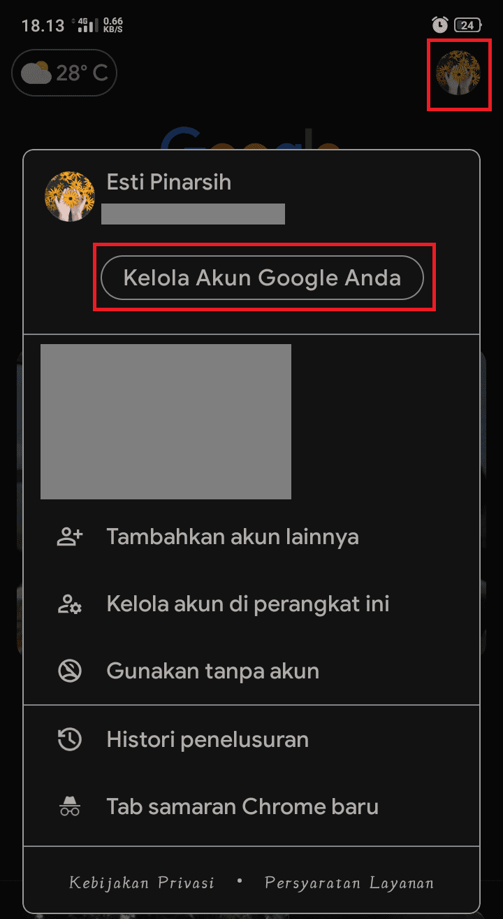 2. Sekarang, buka aplikasi Google di perangkat android kamu dan kemudian tekan ikon foto profile disisi kanan atas. Tekan pada menu Kelola Akun Google Anda pada email yang ingin kamu tambahkan email pemulihan.