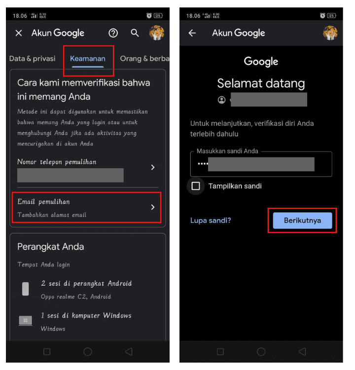 4. Untuk bisa menambahkan email pemulihan, tekan ikon panah kanan pada menu email pemulihan dan kemudian ketikkan password email kamu pada kolom yang tersedia. Tekan Berikutnya.