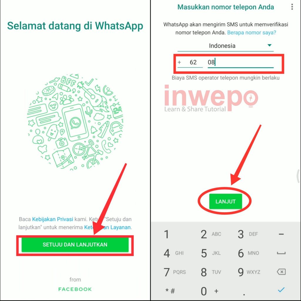2. Langkah kedua, buka aplikasi coocoowhatsapp kemudian tap menu Setuju dan Lanjutkan. Lalu masukkan nomor seluler seperti biasa untuk masuk ke akun WhatsApp masing-masing.
