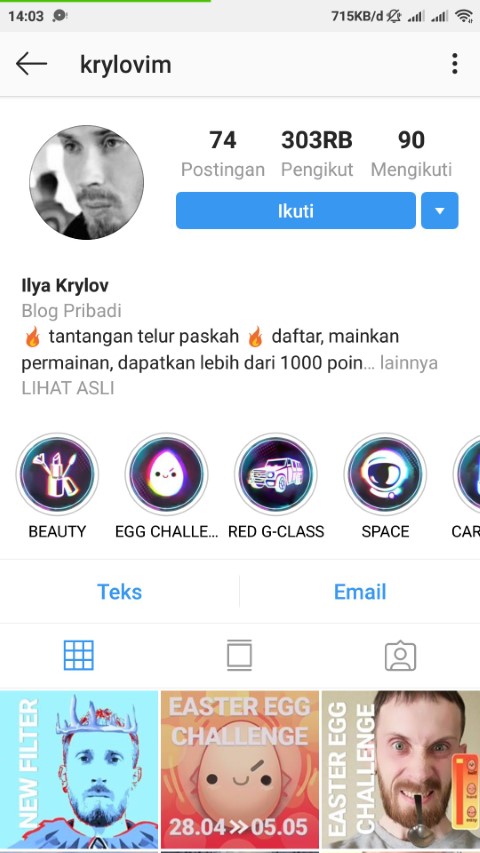 2. Lalu kamu buka aplikasi Instagram dan cari akun dengan id krylovim dan follow akun tersebut (alasan harus follow akan dijelaskan dibawah artikel).