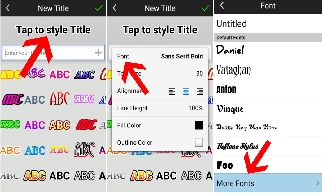 3. Lalu kamu tekan tulisan Tap to style Title – Font – Scroll ke bawah dan pilih More Fonts.