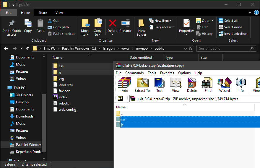 1. Unduh paket front-end framework pada website penyedia yang di tuju (Pada kali ini, kita menggunakan paket UIKit). Nantinya kamu akan mendapatkan file zip atau rar yang berisikan komponen CSS dan JS.