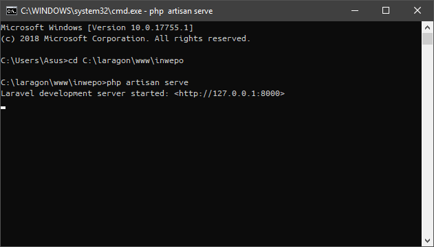 7. Jalankan localhost pada Laravel, dengan cara mengarahkan posisi Command Prompt (atau biasa disebut sebagai CMD) pada direktori Laravel, lalu masukkan perintah berikut kedalam CMD: