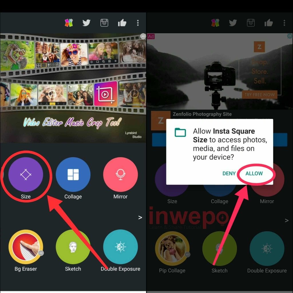 2. Buka aplikasi Instasquare Photo Editor, kemudian pilih menu Size lalu pilih menu Allow untuk menambahkan foto dari galeri smartphone kamu.