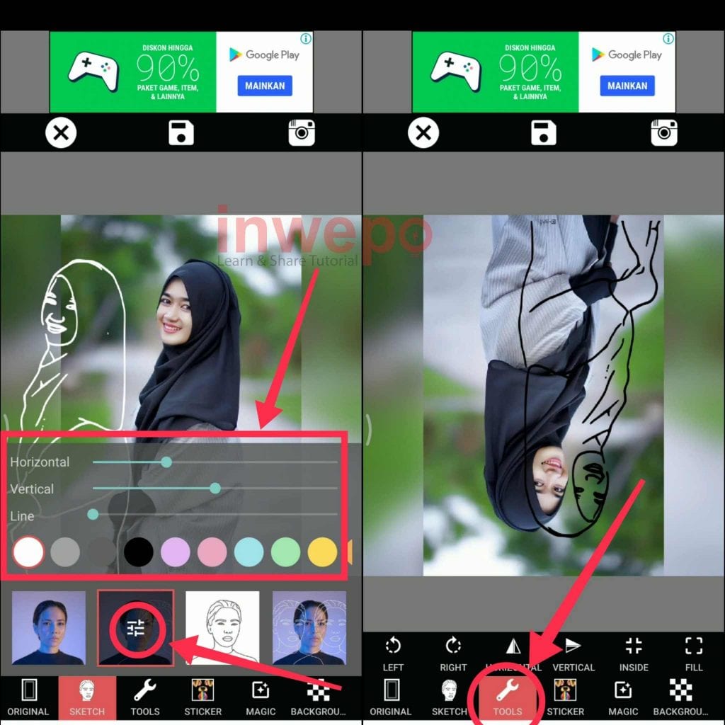 4. Tap icon 3 garis yang berada di tengah model sketsa yang kamu pilih untuk memunculkan menu yang lain. Gunakan menu Horizontal dan Vertical untuk menempatkan gambar sketsa pada posisi yang kamu inginkan. Kemudian menu Line untuk menambah ketebalan atau menipiskan garis sketsa. Lalu color bar untuk memberi warna pada sketsa. Jika sudah gunakan menu Tools untuk merotasi dan juga mirroring.