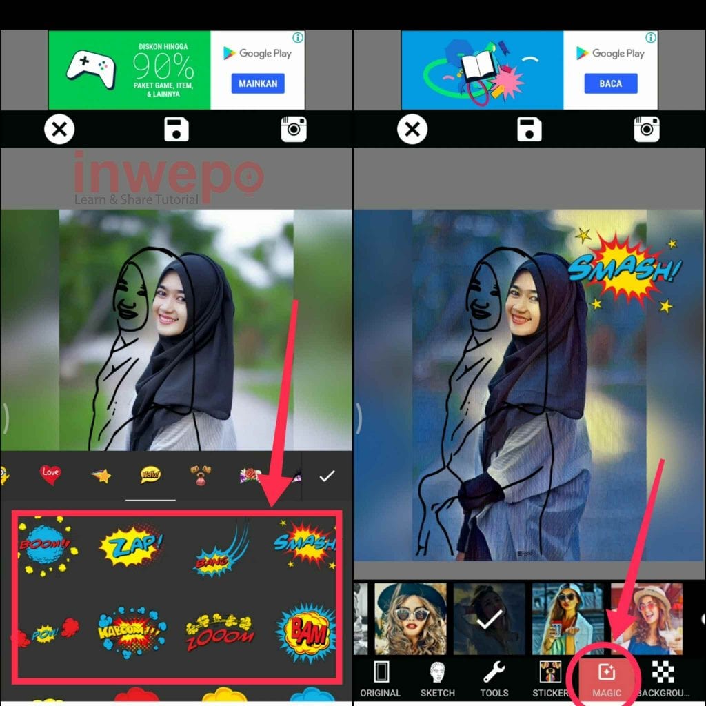 5. Tap menu Sticker untuk menambahkan stiker kemudian tap menu Magic untuk menambahkan efek atau filter.