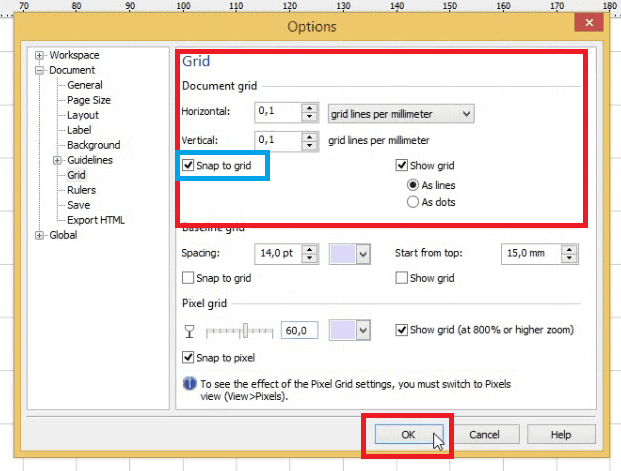 4. Lalu kamu atur pengaturan yang telah disediakan oleh Coreldraw, kamu hanya perlu merubah pengaturan yang berada di dalam kotak merah saja, dan untuk kotak warna biru adalah fitur yang membuat cursor kamu bisa menempel pada tiap titik garis bantu.
