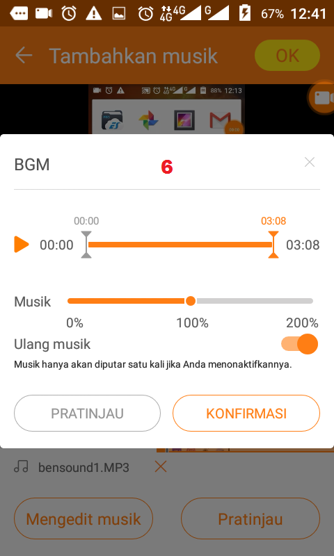 6. Aturlah kecepatan musik, intonasi musik, durasi musik, atau potongan musik secara tertentu. Setelah diatur, silahkan ketuk Pratinjau. Apabila menurut kamu, hasil pratinjau musik itu belum cocok, silahkan ketuk back pada smartphone kamu dan edit lagi sampai tuntas dan cocok bagi kamu. Apabila menurut kamu, hasil pratinjau musik itu cocok, silahkan ketuk back pada smartphone kamu dan ketuk Konfimasi. Setelah itu, ketuk OK.
