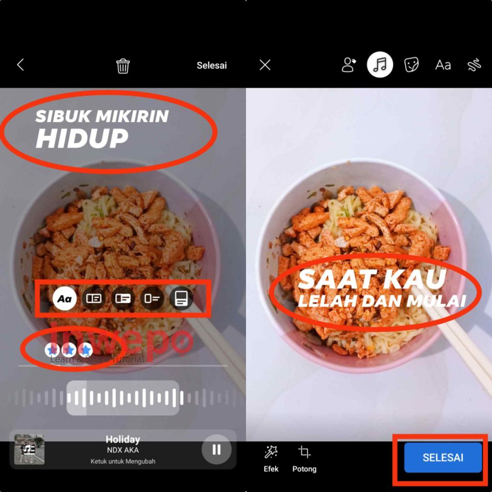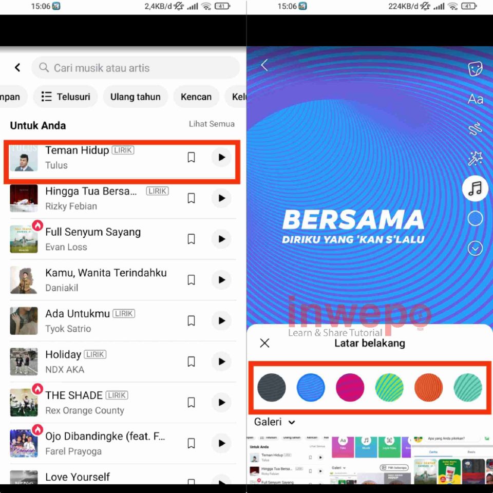 2. Sama halnya dengan postingan pada konten feed, untuk memunculkan lirik pilih lagu dengan tanda Lirik. Berikutnya atur background dengan warna yang sudah di sediakan di bagian bawah.
