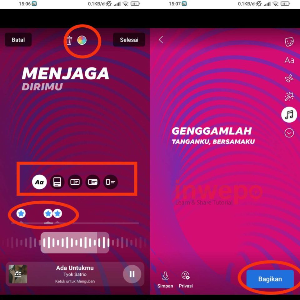 3. Gunakan Color pallete yang ada di bagian atas untuk mengganti warna Lirik. Untuk menu yang lain masih sama seperti kartu musik dan juga icon bintang untuk mengganti lirik. Terakhir tap menu Bagikan untuk membagikan story musik lirik yang sudah kalian buat.