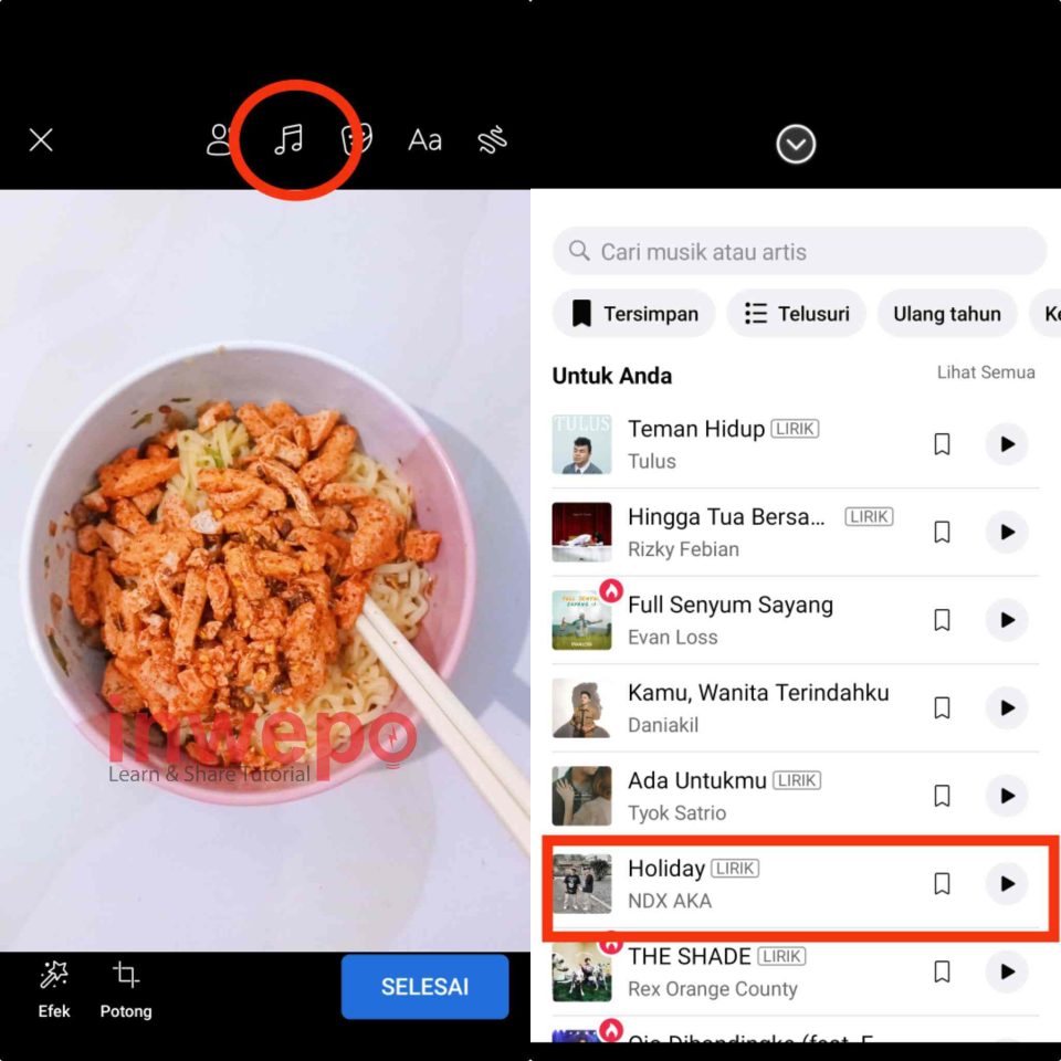2. Untuk menambahkan musik dan lirik kalian tap icon musik di bagian atas. Lalu pilih musik yang ingin kalian pakai. Pastikan memilih lagu dengan tanda Lirik agar nantinya Lirik lagu bisa muncul.