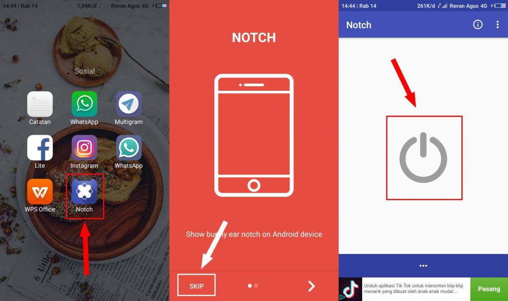 2. Setelah aplikasi sudah di download dan terinstall buka aplikasi Notch lalu pilih SKIP kemudian tap gambar power yang ada di tengah.
