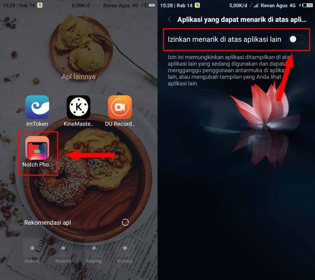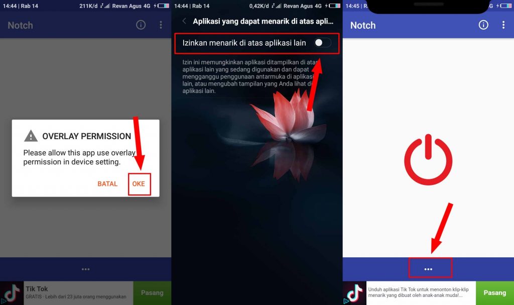 3. Akan muncul notif pilih OKE, setelah itu aktifkan atau geser ke kanan tombol Izinkan menarik di atas aplikasi lain. Bila sudah Notch akan muncul di bagian atas layar selanjutnya tap menu titik 3 yang ada di bawah.