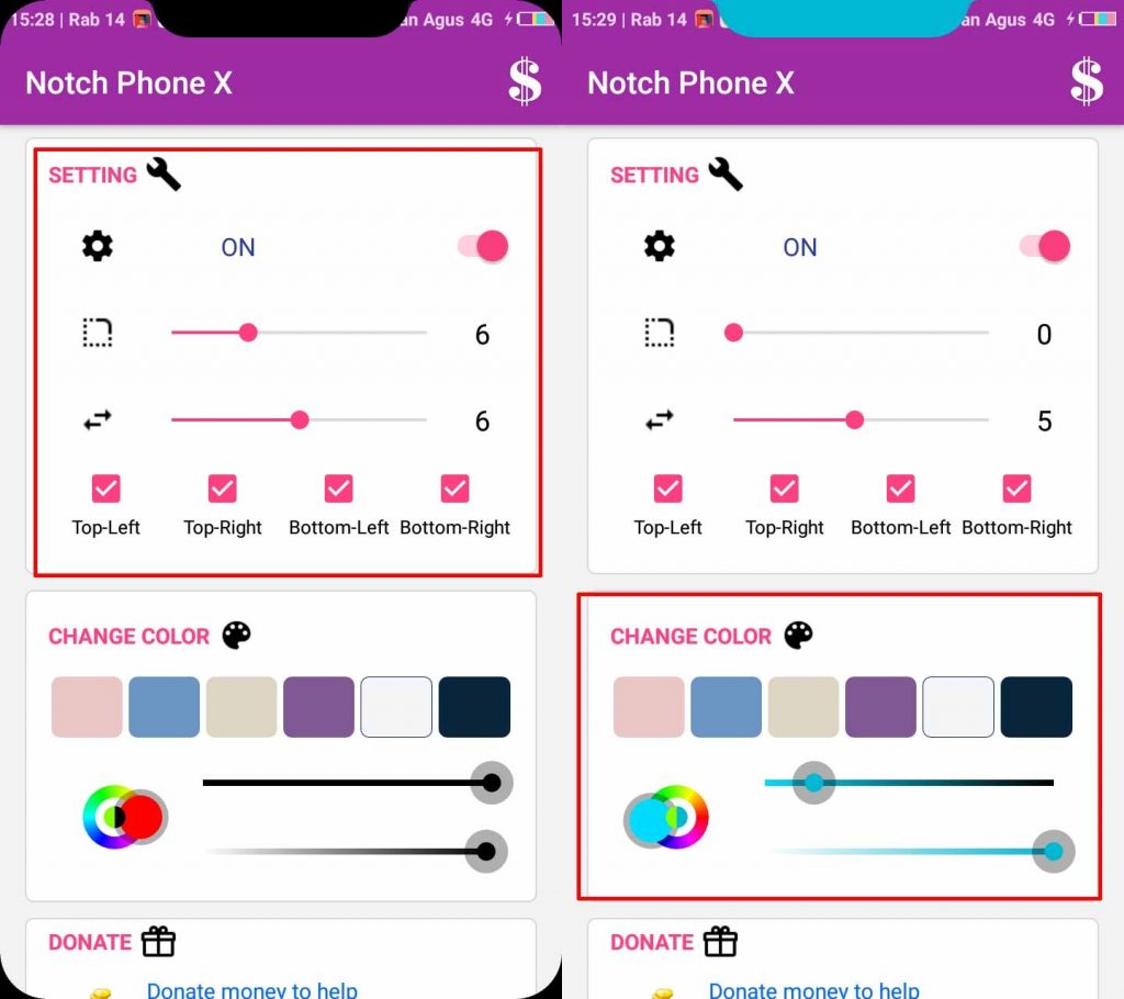 3. Notch dan sudut lengkung akan muncul tapi kamu bisa mengatur ukuran notch dan sudut lengkung menggunakan menu SETTING dan menu CHANGE COLOR untuk merubah warnanya.