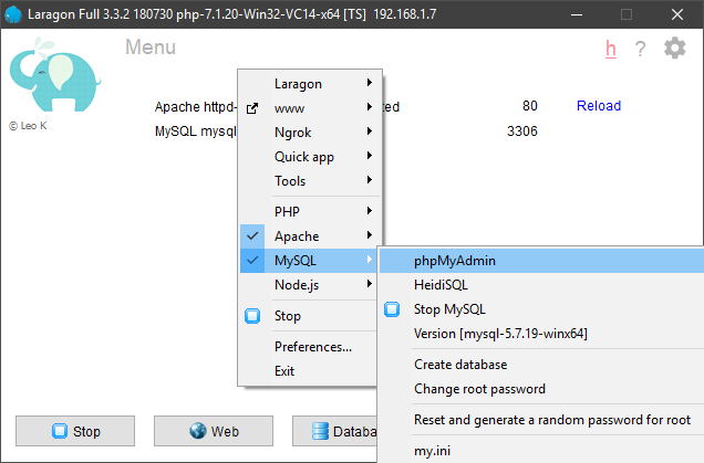 4. Arahkan mouse pada aplikasi Laragon, lalu klik kanan untuk memunculkan pengaturan aplikasi. Pada kolom MySQL, pilih opsi phpMyAdmin untuk memunculkan halaman phpMyAdmin pada browser kamu.