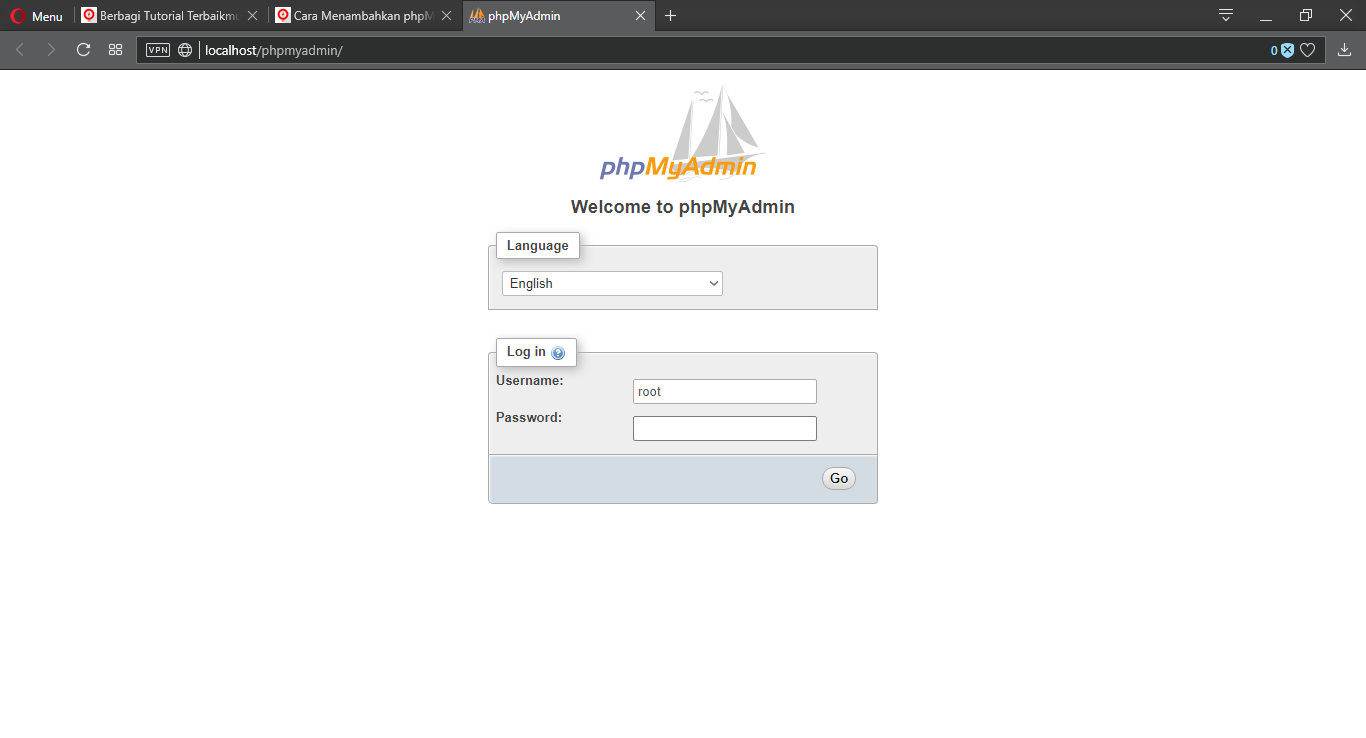 5. Jika berhasil, nantinya akan muncul halaman login aplikasi phpMyAdmin. Aplikasi phpMyAdmin sudah siap untuk di gunakan.