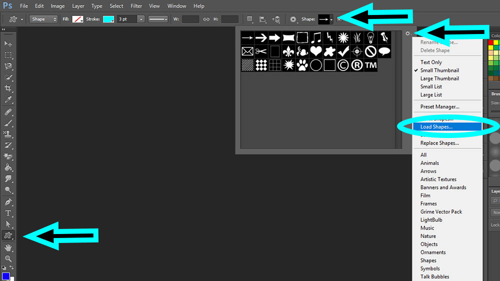 3. Buka aplikasi Adobe Photoshop CS6, pilih Ikon Custom Shape dan masuk ke pengaturan Custom Shape. Selanjutnya pilih Load Shape.